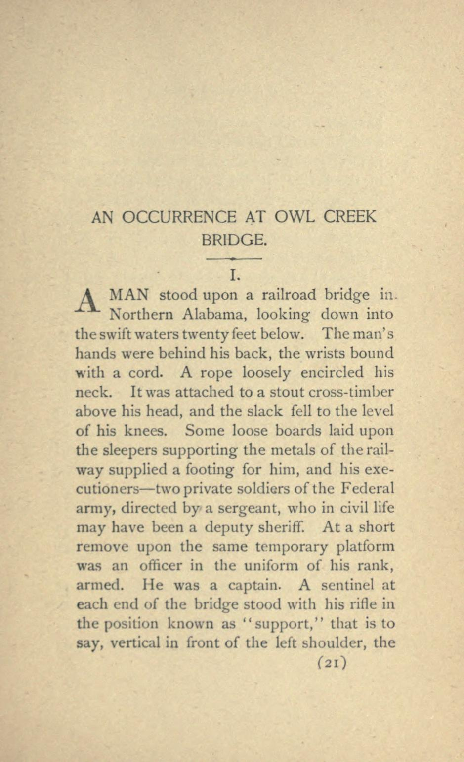 ಉತ್ತರ ಅಲಬಾಮಾದ ಆ ರೈಲ್ವೇ ಸೇತುವೆಯ ಮೇಲೆ ಅವನು ನಿಂತಿದ್ದ. ಅವನ ದೃಷ್ಟಿ ಇಪ್ಪತ್ತು ಅಡಿ ಕೆಳಗೆ ಭೋರ್ಗರೆಯುತ್ತಿದ್ದ ನದಿಯ ನೀರಿನ ಮೇಲೆ ನೆಟ್ಟಿತ್ತು. ಅವನ ಎರಡೂ ಕೈಗಳನ್ನು ಹಿಂದಕ್ಕೆ ಬಿಗಿದು ಕಟ್ಟಲಾಗಿತ್ತು ಮತ್ತು ಅವನ ಕುತ್ತಿಗೆಯ ಸುತ್ತ ಒಂದು ಹಗ್ಗವನ್ನು ಕುಣಿಕೆ ಹಾಕಲಾಗಿತ್ತು. ಹಗ್ಗದ ಮೇಲ್ತುದಿಯನ್ನು ಸೇತುವೆಯ ಮೇಲಿನ ಅಡ್ಡ ಕಂಬಕ್ಕೆ ಕಟ್ಟಿದ್ದರೆ ಕುತ್ತಿಗೆಗೆ ಕುಣಿಕೆ ಹಾಕಿ ಉಳಿದಿದ್ದ ಹಗ್ಗ ಅವನ ಮೊಣಕಾಲಿನವರೆಗೆ ನೇತಾಡುತ್ತಿತ್ತು. ರೈಲು ಹಳಿಗಳ ಮೇಲೆ ಅವನಿಗೆ ಮತ್ತು ಅವನನ್ನು ನೇಣಿಗೇರಿಸುವವರಿಗೆ ನಿಲ್ಲಲು ಅಡ್ಡ ಹಲಗೆಗಳನ್ನು ಹಾಸಿದ್ದರು. ಈ ಕೆಲಸಕ್ಕೆಂದೇ ಇಬ್ಬರು ಫೆಡರಲ್ ಸೇನೆಯ ಸೈನಿಕರು ಮತ್ತು ಮೇಲ್ವಿಚಾರಕನನ್ನಾಗಿ ಒಬ್ಬ ಸಾರ್ಜೆಂಟ್ನನ್ನು ಹಚ್ಚಿದ್ದರು. ತುಸು ದೂರದಲ್ಲಿ, ಅದೇ ತಾತ್ಕಾಲಿಕವಾಗಿ ಹಾಸಲಾಗಿದ್ದ ಅಡ್ಡ ಹಲಗೆಯ ಮೇಲೆ ಒಬ್ಬ ಸಮವಸ್ತ್ರ ಧರಿಸಿದ್ದ ಸಶಸ್ತ್ರ ಕ್ಯಾಪ್ಟನ್ ನಿಂತಿದ್ದ. ಸೇತುವೆಯ ಎರಡೂ ತುದಿಗಳಲ್ಲಿ ಶಿಷ್ಟಾಚಾರದಂತೆ ಎಡ ಭುಜಕ್ಕೆ ನೇರವಾಗಿ ಅಂಗೈ ಆಸರೆಯಲ್ಲಿ ರೈಫಲ್ ಹಿಡಿದಿದ್ದ ಒಬ್ಬೊಬ್ಬ ಸೈನಿಕರು ಕಾವಲು ನಿಂತಿದ್ದರು. ಸೇತುವೆಯ ಮಧ್ಯ ಭಾಗದಲ್ಲಿ ಏನು ನಡೆಯುತ್ತಿದೆ ಅಥವಾ ನಡೆಯಲಿದೆ ಎನ್ನುವುದು ಅವರಿಗೆ ಕಾಣಿಸುತ್ತಿರಲಿಲ್ಲ. ಅವರಿಗೆ ಸೇತುವೆಯನ್ನು ಕಾಯುವ ಕೆಲಸಕ್ಕೆ ಹಚ್ಚಿದ್ದರು ಮತ್ತು ಅವರು ಅದನ್ನಷ್ಟೇ ನಿರ್ವಿಕಾರವಾಗಿ ಮಾಡುತ್ತಿದ್ದರು.
